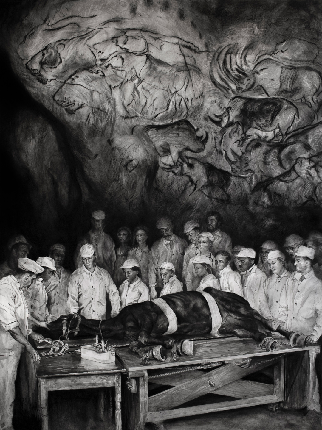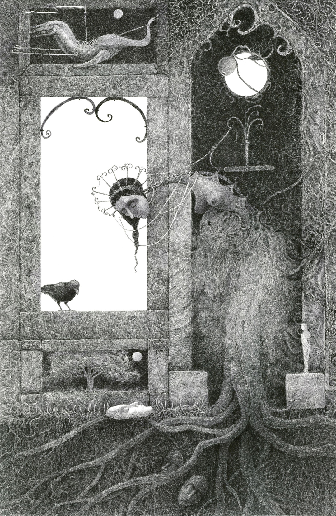 Lipton will provide a lecture about her practice from 5-6 p.m. on Friday, Jan. 17, 2025 in the Mullen & James Humanities Hall on the UNC Asheville campus. Laurie Lipton was born in New York in 1953 and began drawing at the age of four. She was the first person to graduate from Carnegie-Mellon University in Pennsylvania with a Fine Arts Degree in Drawing (with honours). She has lived in Holland, Belgium, Germany, France, London and moved back to the USA after 36 years abroad. She currently resides in Los Angeles. Her work has been exhibited extensively throughout Europe and the USA. Lipton was inspired by the religious paintings of the Flemish School. She tried to teach herself how to paint in the style of the 16th century Dutch Masters and failed. When traveling around Europe as a student, she began developing her very own peculiar drawing technique building up tone with thousands of fine cross-hatching lines like an egg tempera painting. “It’s an insane way to draw”, she says, “but the resulting detail and luminosity is worth the amount of effort. My drawings take longer to create than a painting of equal size and detail.” “It was all abstract and conceptual art when I attended university. My teachers told me that figurative art went “out” in the Middle Ages and that I should express myself using form and shapes, but splashes on canvas and rocks on the floor bored me. I knew what I wanted: to create something no one had ever seen before, something that was brewing in the back of my brain. What I wanted fell between “isms”. It wasn’t “surreal”, it wasn’t “real”... it was lurking between the two. Black and white ached. "I realised that it was perfect for the imagery in my work. When people see my drawings in real life, as opposed to online, they are astonished by the amount of work in them. They require your complete attention. You need to come close and examine every crazy detailed inch of every intricate piece to get the full WOW effect.”