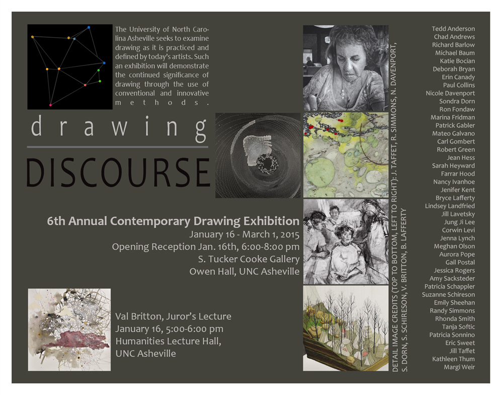 The UNC Asheville Department of Art & Art History will open Drawing Discourse, the university's sixth annual international juried exhibition of contemporary drawing, with a lecture by Juror Val Britton, at 5 p.m. Friday, Jan. 16, in the Humanities Lecture Hall on campus. An opening reception will follow from 6-8 p.m. in the S. Tucker Cooke Gallery in Owen Hall. These events and the exhibit are free and open to the public.