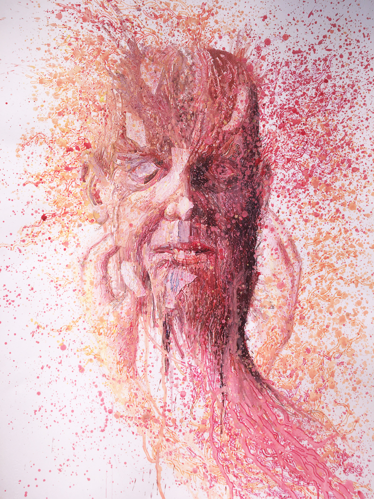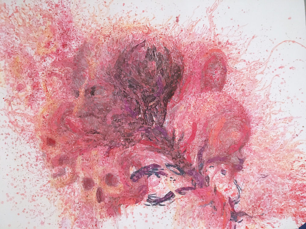 contains a conglomeration of different media: ink, paint, and collage, conveying the complexity