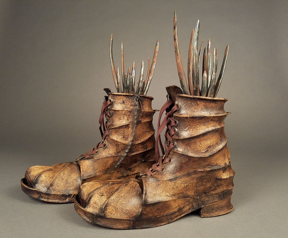 Darcy Ward, Soul of my Sole, Mild Steel, Handmade Sawgrass Paper, Walnut Ink, Coco Bark, Shoe Laces, 2021
