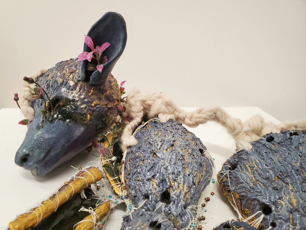 Savannah Nemeth, Lamb, Glazed Earthenware, Alcohol Ink, Acrylic Paint, Highland Wool Roving, Thread, Beads, Repurposed Artificial Flowers, Galvanized Steel Wire, 2021-2022