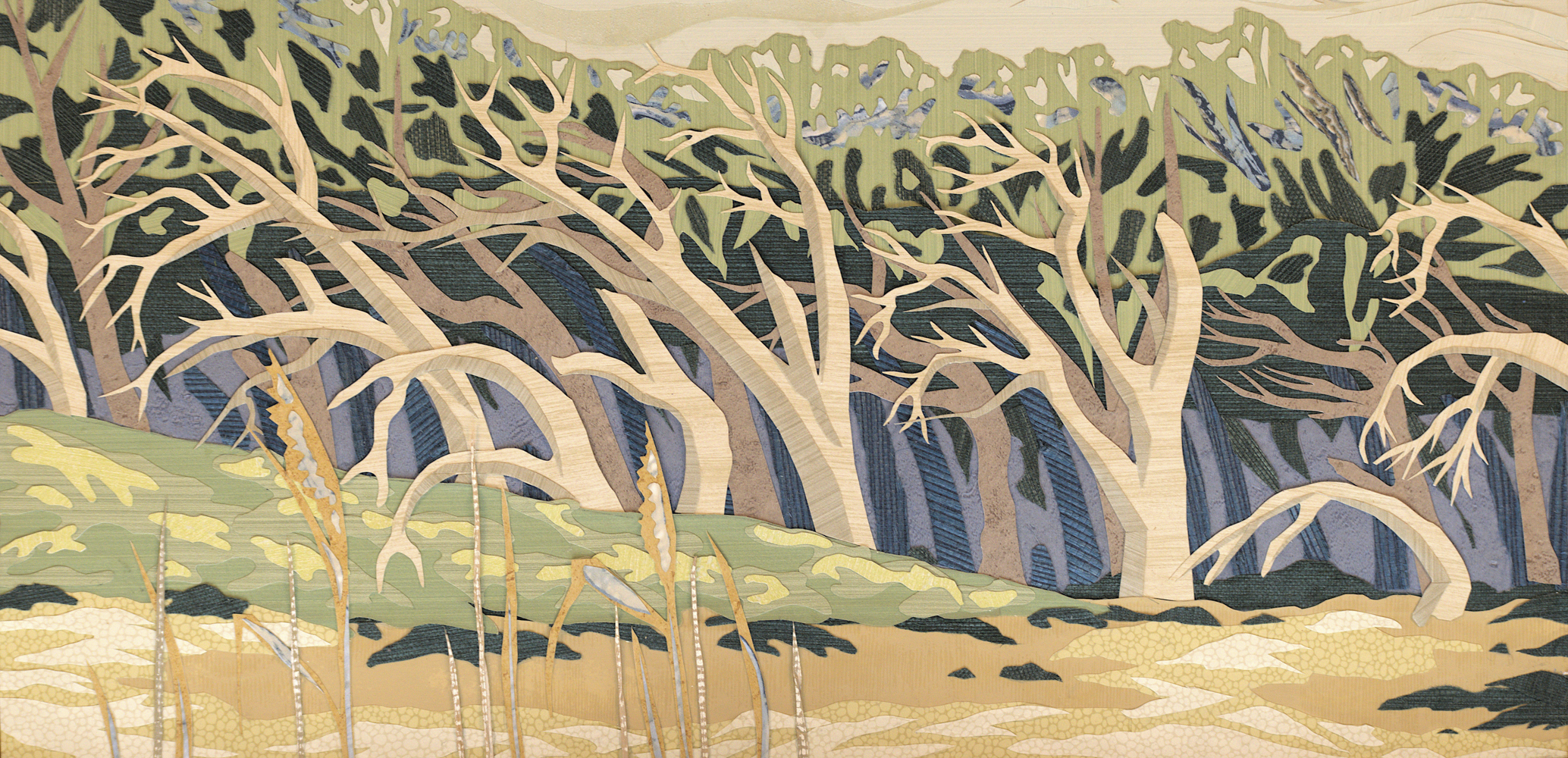 Figurative elements in my work include flora and fauna from the regions and objects that show personal interaction with these environments. I often create work that observes the rural domain as a sort of fray of human life where things become considered banal, camp, or of the past. I look to various groups of artists for inspiration, from American folk artists and self-taught artists to modernist and post-pop landscape painters, as well as contemporary collagists. Painterly examples of these artists include Charles E. Birchfield, Henri Rousseau, and David Hockney. These are visionary painters that wish to extract a spiritual essence of landscapes. These artists are known to make their work from intuitive and design-oriented decisions. Other artists such as marquetrist Alison Elizabeth Taylor and collagist Njideka Akunyili Crosby have inspired my materials-based approach.