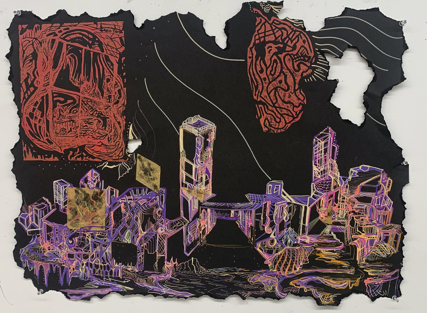 City Beyond, 22x33 inch Ink Painting with Linocut, 2022