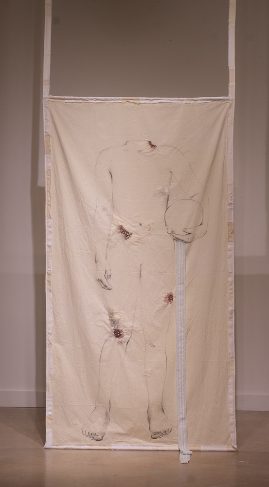 Huan LaPlante, Death Song, charcoal, wood, plant-dyed fabrics, fiber paper, thread, and pieces of my grandfather’s shirt, 2022
