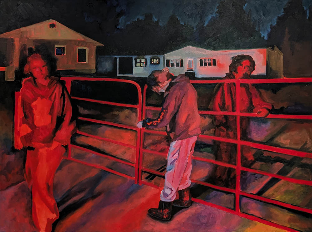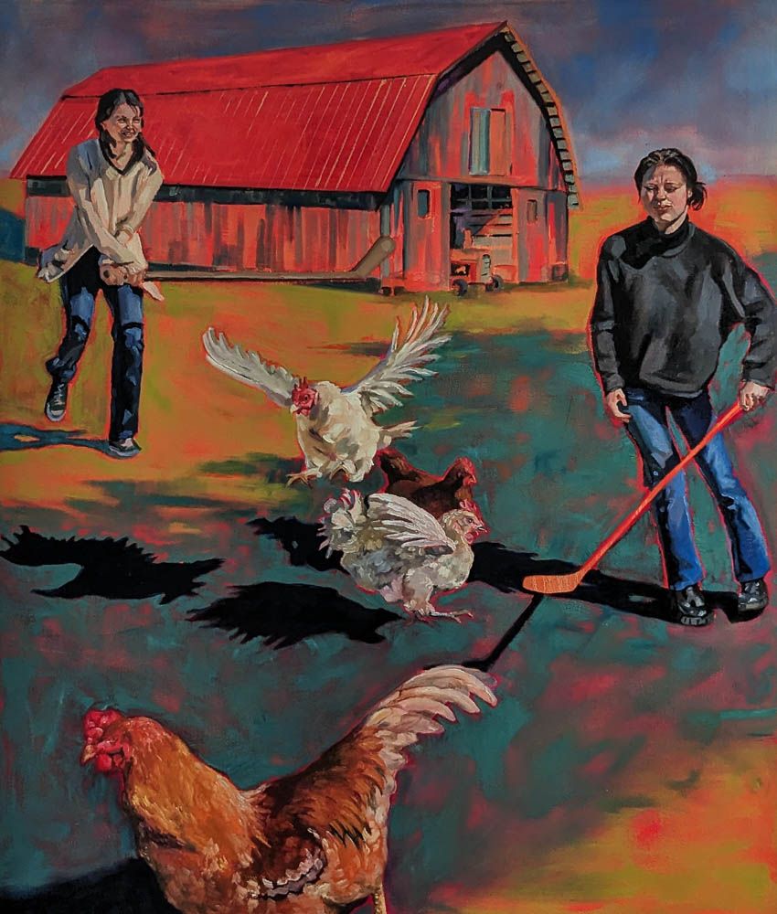 Nostalgia is the recollection of prior moments, places, persons and experiences for which the individual has positive personal associations. The human psyche employs nostalgia as a tool for coping with adverse events or emotions such as homesickness. Nostalgia is a bridge between one’s past and one’s current sense of self. It reinforces bonds with people and places, provides context for future experiences, and gives comfort during periods of transition. As I progress through my own transition from childhood to adulthood, I am homesick for the safety and familiarity of my Grandmother’s farm and pained by the physical dismantling of my tight knit family group. Each painting’s composition derives from the reenactment and reimagining of specific and personal childhood memories and moments of play, shared with family members in meaningful spaces. This body of work explores the ways in which nostalgia provides comfort and initiates growth during times of change and how the visualization of childhood memories through the creation of these paintings physically documents the experience of nostalgia.