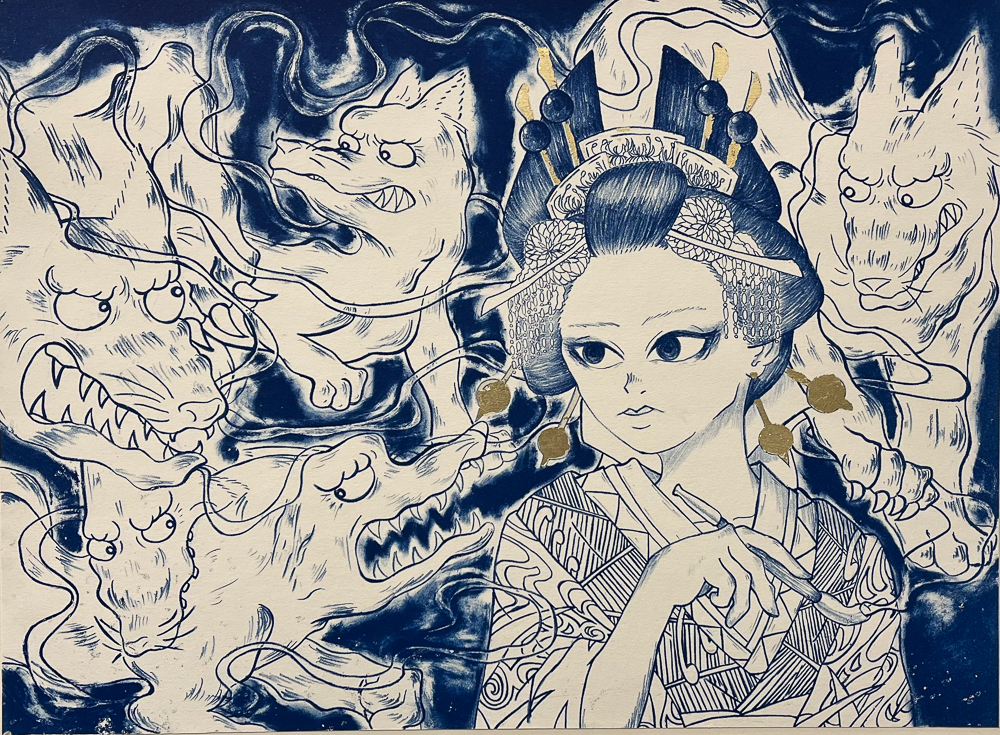 Maho Omiya, 妖狐 (Youko), stone lithograph on paper, gold leaf, 2024