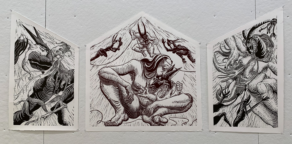 Lee Robinson, Guts Alterpiece, woodcut, 2024