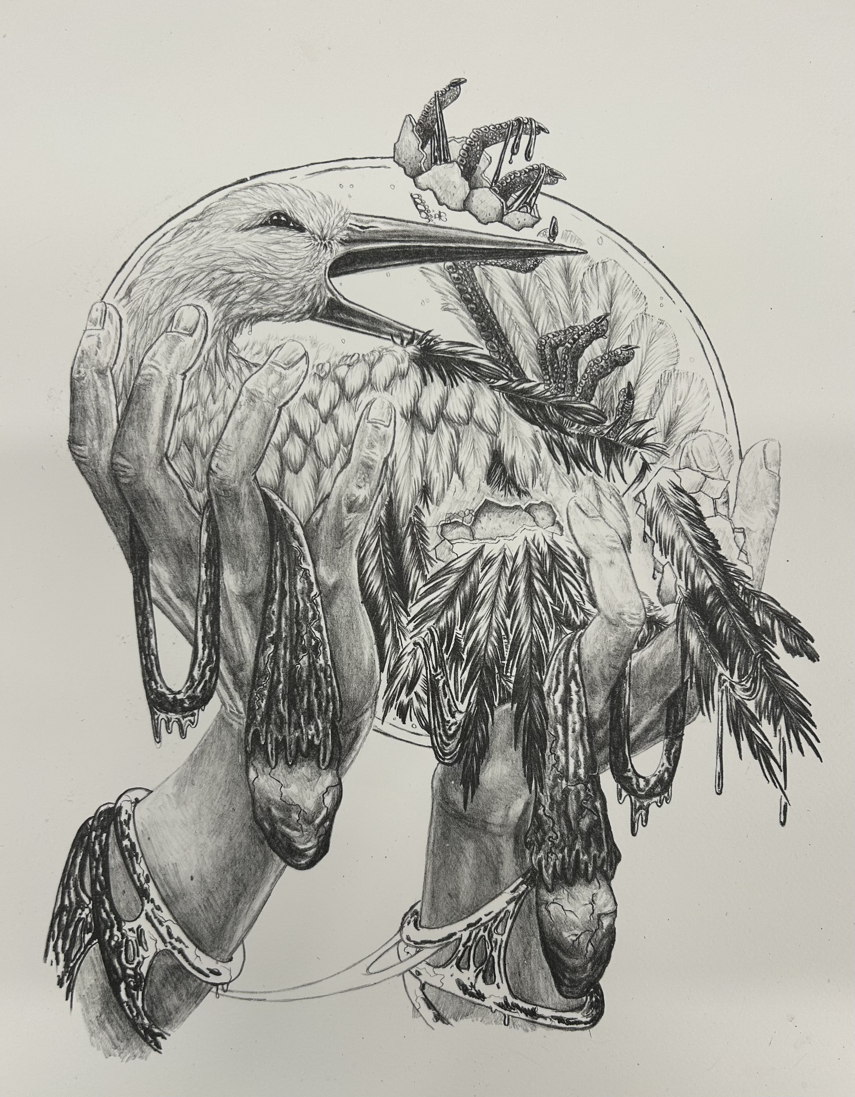Since the beginning of human history, Homo sapiens has communicated through stories. Oral traditions became legends which became religion. Through the lens of religion, human beings made sense of the fleshy, bloody world in which they dwelt. Animals often served as the canvas by which religion, lore, and tradition were drawn. Today, the power of the animal form in narrative and visual context elicits an emotional response and kinship. Mythology and religion have enabled humans to interpret harsh biological realities through certain narratives. In times of grief or disaster, human beings are forced to confront these narratives and ask what value they contain. Religion holds beauty for some and pain for many; this body of work seeks to expose this strange dichotomy. Through the dissection and exploration of familial beliefs and traditions, this work unravels the symbolism that birds and other creatures common to religious tradition embody. Through the reinvention of creaturely lore, the viewer is asked to look within and confront their own mythos.