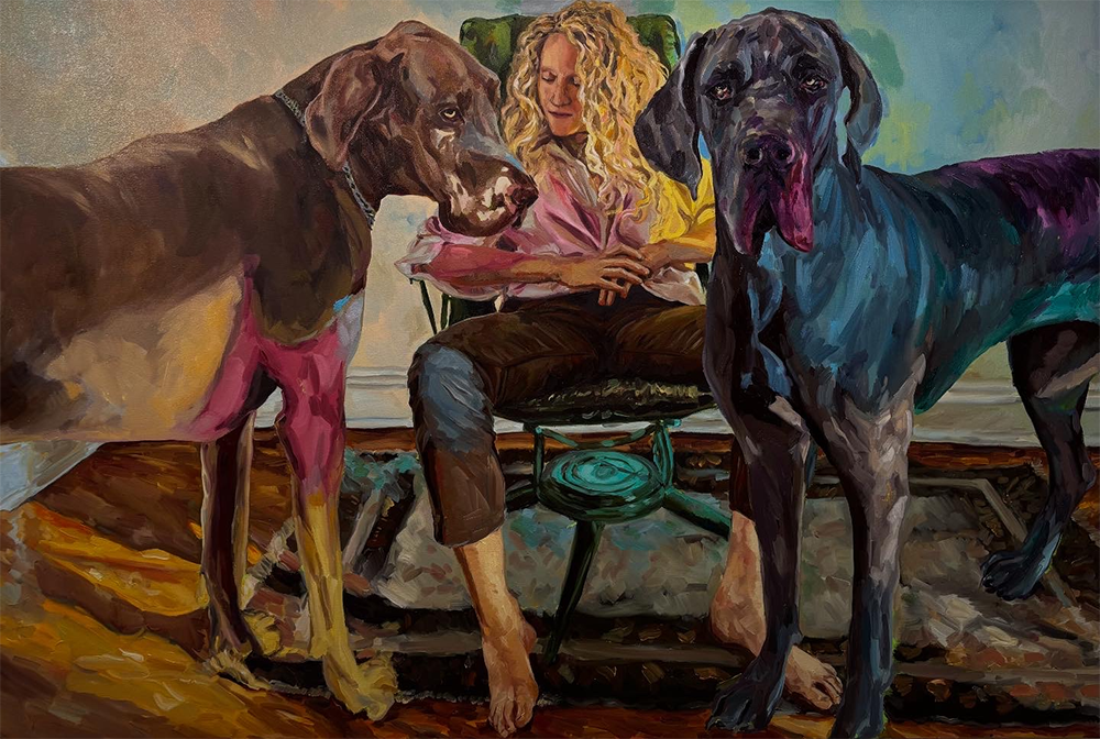 Feminine strength is extended through the inclusion of the Great Danes. No longer symbols of male ownership or domesticity, the dogs embody sacred protectors. They mirror the emotional states of the women they accompany— alert, loyal, and discerning — while evoking mythic resonance, from the wolf-mothers of Roman lore to Artemis’s hounds. The women and dogs are not beholden to anyone’s gaze. Instead, they look inward and toward each other.