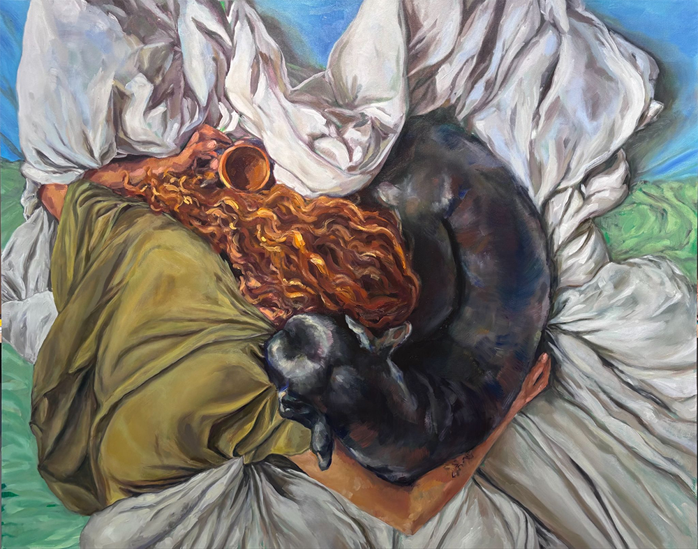 My motivations for the work are deeply personal yet universally relevant. I offer the viewer a vision rooted in joy in spite of cruelty, abuse, and oppression. The weight of such forces is not overlooked; rather, the narrative of feminine suffering is challenged by the innate resistance within women’s relationships.