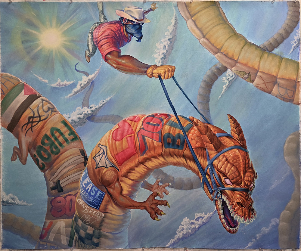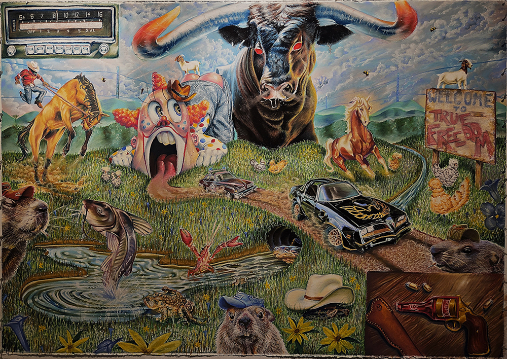 My work aims at finding humor in all things, specifically living in the South, while also appreciating and sharing the beauty I see in it. I want my work to be fully immersive for the viewer because of the larger-than-life compositions full of different subjects. The flow of time and the scale of everything within a piece reflects the flow of consciousness and causes the viewer to find all the details within a piece. My work is comedic but also calming and serene. My love for where I’ve grown up and the pop culture I witnessed shines through in my work, with references to movies like Smokey and the Bandit, comic books from DC Comics, tv shows and cartoons like Looney Tunes, etc. Serene landscapes are also important, growing up in the foothills of Appalachia taught me the beauty of nature. Cartoons have a motion and natural personality that I bring to my work, this mixed with more naturalistic elements allow me to be inventive. These points drive me to make my work.