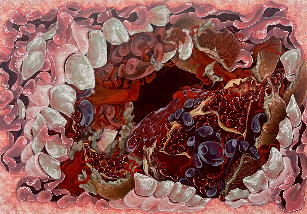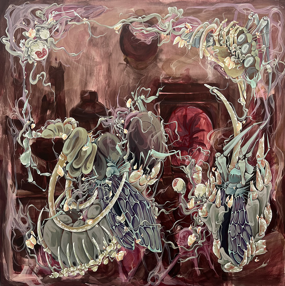 Drawing from a collection of cultural mythology, folklore, and religious texts for its subject matter, this body of artwork explores imagery prevalent in contemporary society as well as from ancient history. By focusing on macabre transformations of anatomical forms and monstrous beings and deities, the work seeks to overwhelm the viewer with imagery that is both shocking and disquieting, yet visually inspiring and fantastical. Through this tension, it invites the viewers to consider how dread or wonderment might both be instrumental in constructing their own belief system.