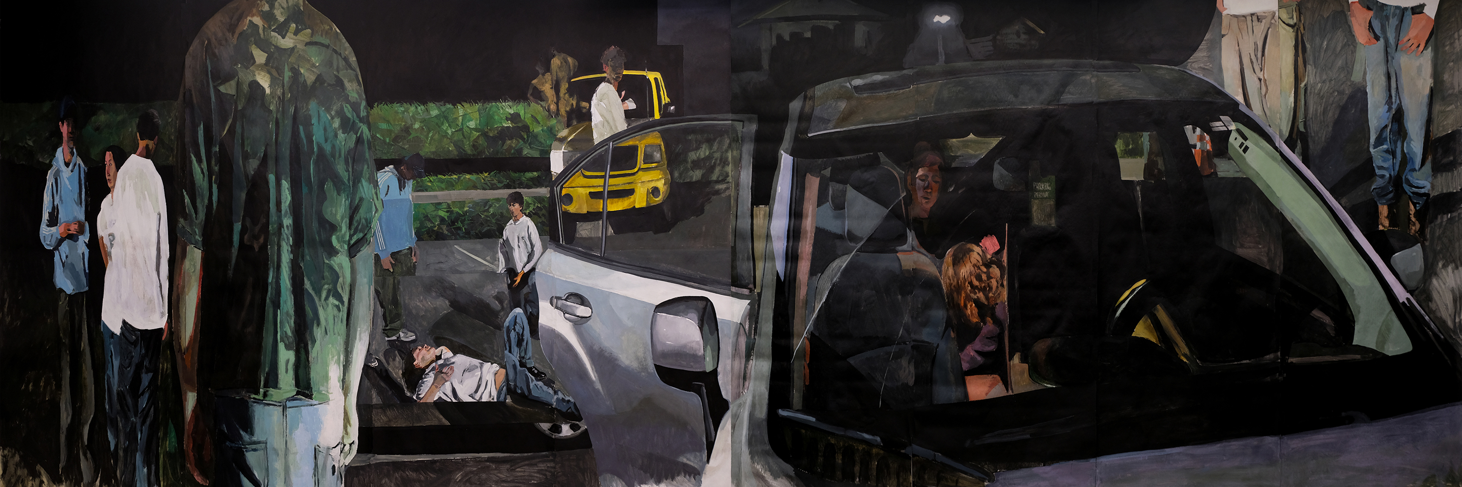 My work centers on the fragile balance between safety and vulnerability, particularly within adolescence. Growing up, safety is something we actively seek. Yet, the spaces teenagers find refuge in often become charged with exposure. Limited mobility and the desire to hide from figures of authority compress experience, pushing private emotion into borrowed or temporary shelters. Through painting and spatial installation, I return to these domestic and suburban environments as mutable interiors where protection and risk coexist. Informed by ideas of the optics of power, I consider how visibility operates as a form of control, how the act of being seen structures behavior, even in seemingly private spaces. Bedrooms, cars, and parking lots become sites shaped by surveillance, whether institutional or internalized. Fragmented imagery and shifting light echo these unstable conditions of perception, suggesting that adolescence is not only a search for refuge, but an early negotiation with systems that render us visible, legible, and therefore vulnerable.